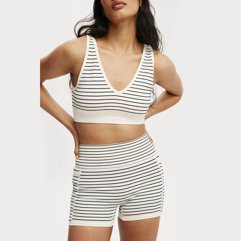 우리 제품은 신체 활동 중에 최대한의 편안함을 보장하는 매끄러운 디자인을 특징으로 합니다. 신축성 있는 원단은 움직이는 동안 고객의 체형에 맞춰 완벽한 핏을 제공합니다. 이 여성용 심리스 스트라이프 스포츠 브라 뒷면의 V넥과 U자형 디자인은 눈길을 사로잡으며 단조롭게 보이지 않습니다.